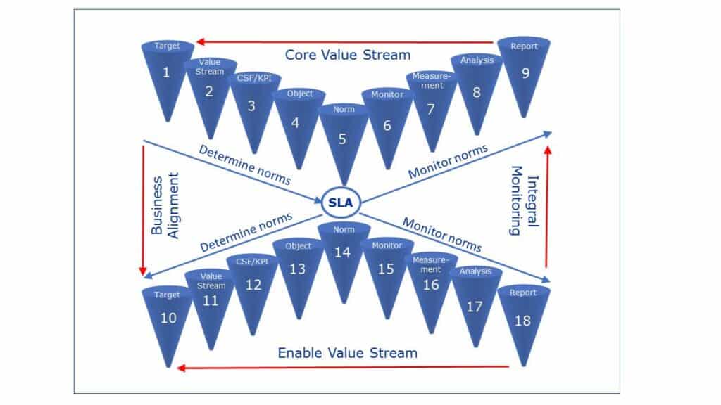 De rechterkant van figuur 2 vormt het spiegelbeeld van de linkerkant. Zo moet voor een te meten ICT-service een meetinstrument (6) worden ingericht. De KPI’s moeten gemeten (7) worden. De meetwaarden moeten geanalyseerd (8) worden om te bepalen welke core value streams verbeterd moeten worden. Over de doelen wordt tenslotte gerapporteerd (9). De onderkant van Figuur 2 vormt het spiegelbeeld van de bovenkant. Daar waar de bovenkant de gebruikersorganisatie weergeeft, is in de onderkant de serviceorganisatie weergegeven. Hierbij verloopt de flow van opstellen van normen en het meten ervan analoog. Ook hier zijn de pilonen dus horizontaal met elkaar in verband te brengen. Belangrijk is om de tevens de verticale relatie tussen de pilonen te onderkennen.