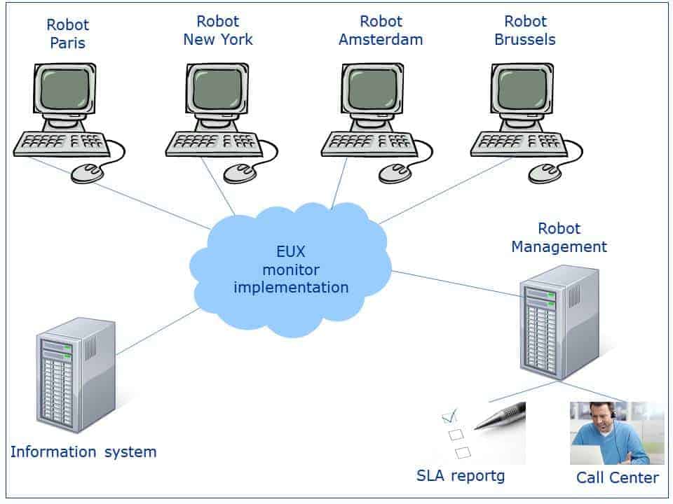 De meeste leveranciers bieden een oplossing waarbij het beheer van de scripts op een centrale server plaatsvindt. Nieuwe of aangepaste scripts worden door de centrale server gedistribueerd naar de robots. Ook de scheduling van de door de robots af te vuren scripts wordt centraal ingeregeld. De resultaten van de robotmetingen worden centraal verzameld en vergeleken met de servicenormen. In geval van een normoverschrijding wordt een alert afgegeven. Figuur 3 toont een voorbeeld van een EUX-inrichting.