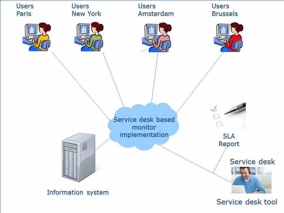 Een ICT-service kan uitéén worden gerafeld in infrastructuur- en applicatiecomponenten. Bijvoorbeeld aan de hand van de Component Failure Impact Analyse (CFIA) van IBM zoals deze binnen ITIL wordt beschreven. De som van deze componenten is bepalend voor de kwaliteit van de ICT-service. De SLA-normen van een ICT-service zijn dus te meten aan de hand van deze componenten. Figuur 2 geeft een schetst van deze monitorarchitectuur.
