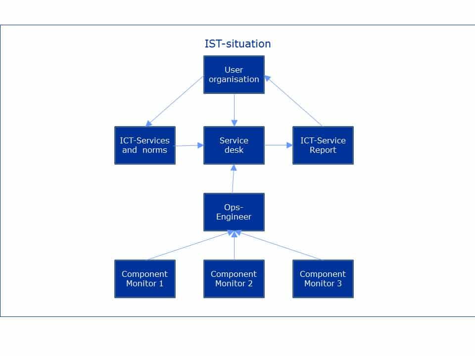 Het verschil tussen de IST- en de SOLL-situatie is duidelijk te zien. De monitortools hebben in de bestaande situatie geen geautomatiseerde interface met de servicedesktool.