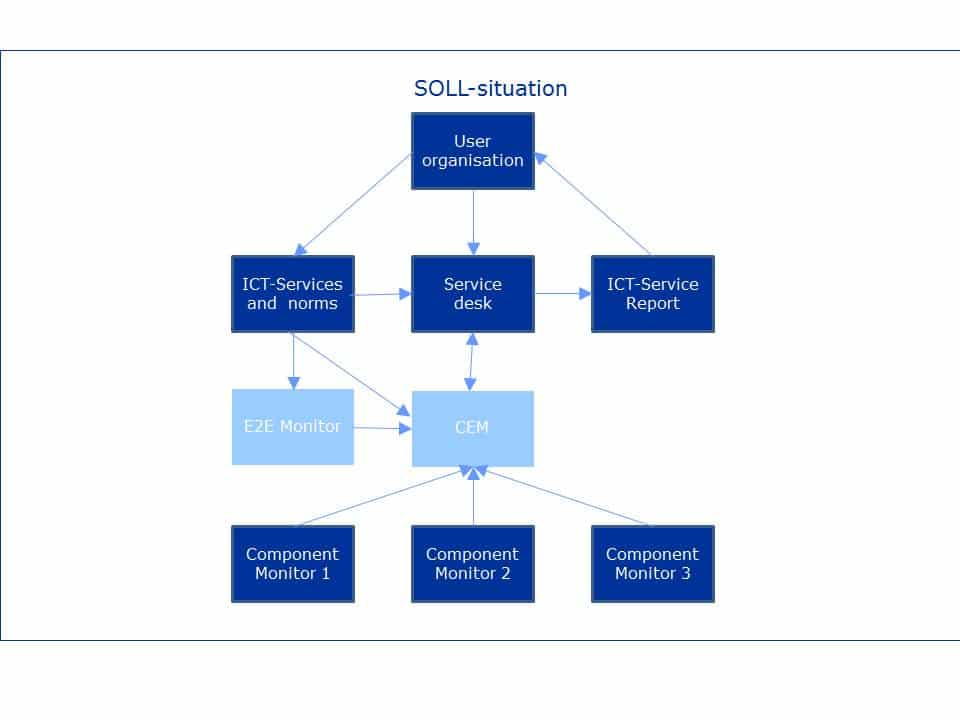 Net als in de huidige situatie stelt de servicelevelmanager in samenwerking met de gebruikers-organisatie de normen voor de ICT-services vast (PR-Mon-03). Deze normen dienen als maatstaf voor de servicedesk medewerkers, de E2E-monitor (PR-Mon-04) en de Centrale Event Manager (CEM). De CEM krijgt events binnen van de E2E-monitor en de componentmonitortools. In de CEM is de ICT-service gemodelleerd op basis van de onderliggende infrastructuur- en applicatie componenten (PR-Mon-02). Hierdoor kunnen verstoringen die E2E worden gemeten verklaard worden door componentmetingen (PR-Mon-01). Op basis van business rules leidt een event wel of niet tot een registratie van een incident in de servicedesk. Op basis van de ingestelde servicenormen vindt de bewaking plaats in de servicedesk en wordt er een SLA-rapportage aangemaakt. Dit architectuurmodel verschilt per organisatie en kan vaak nog verder gedetailleerd worden. De detaillering moet beperkt blijven tot een kaderstelling en geen ontwerp worden.
