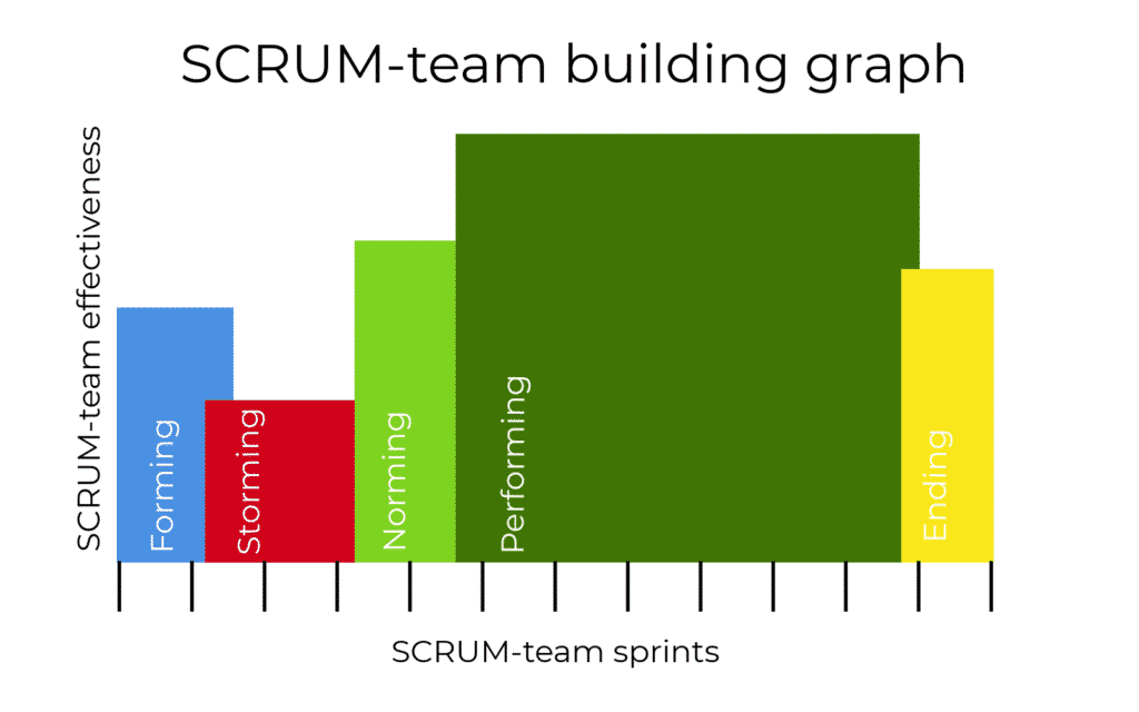 Bruce Tuckman beschreef 4 fasen van teamvorming: Forming, Storming, Norming en Performing. We kunnen niet verwachten dat een nieuw SCRUM-team gelijk goed presteert als het net is samengesteld. Er is meer voor nodig om een team goed te laten presteren. De eerste sprint is nog onwennig en kent veel leermomenten.