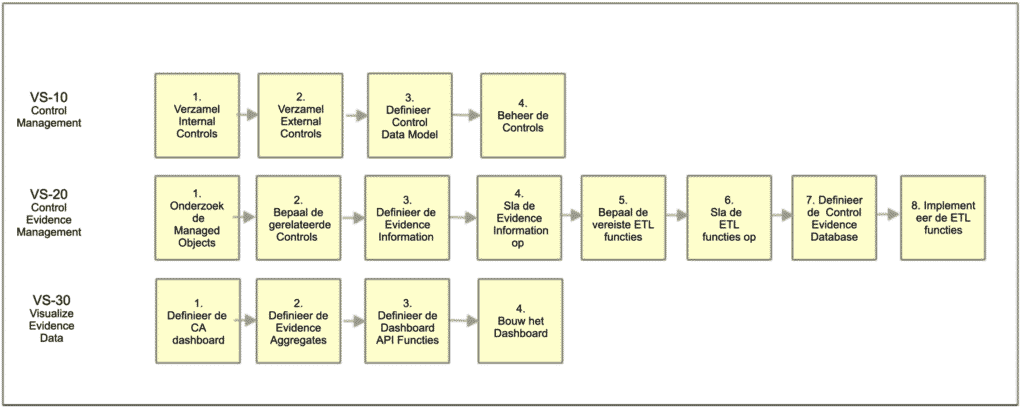 De eerste value stream creëert de Control Definition Database (CDD) zoals gedefinieerd in figuur 1. Deze database bevat alle controles die automatisch moeten worden gecontroleerd. De tweede value stream definieert de datastructuur voor de Control Evidence Database. Deze database is gevuld met het bewijs van de effectiviteit van de controles door gegevens te extraheren uit de beheerde objecten die binnen het bereik vallen. De ETL-functies om dit te bereiken zijn ook gedefinieerd in deze value stream. Last but not least wordt de visualisatie bepaald en de geaggregeerde informatie berekend. De gegevens worden geëxporteerd door het gebruik van REST API`s.