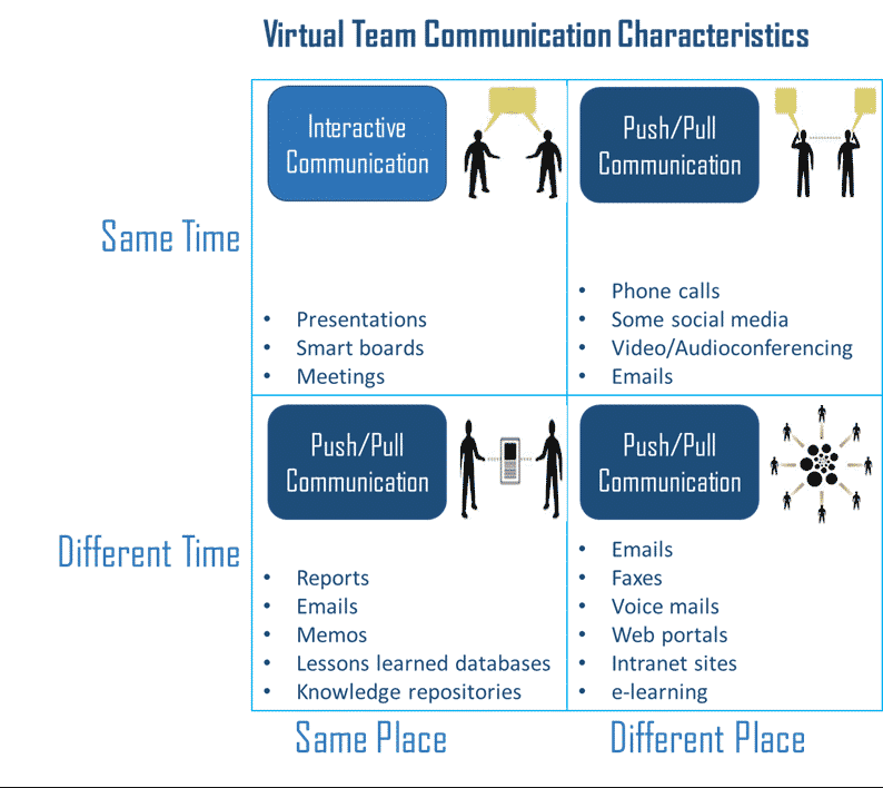 Interactions can take various forms based on time/space factors; analysis of the research and methods used indicates the following communication characteristics for Virtual Team events: