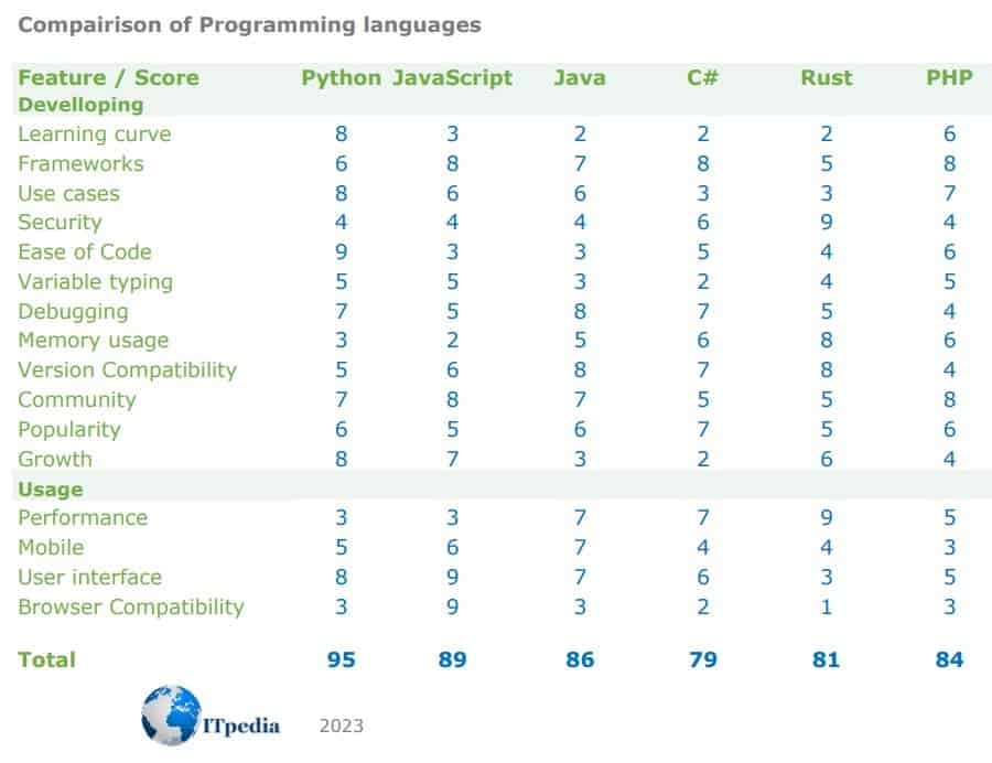 Python, Javascript, Java, C#, Rust en PHP zijn de talen die we vergelijken. De ontwikkeling van programmeertalen staat niet stil, van tijd tot tijd worden er nieuw opties en mogelijkheden aan toegevoegd. De populariteit kan dus in de loop van de tijd en in verschillende contexten variëren. Daarom is het essentieel om rekening te houden met de specifieke vereisten en use cases bij het kiezen van programmeertalen.