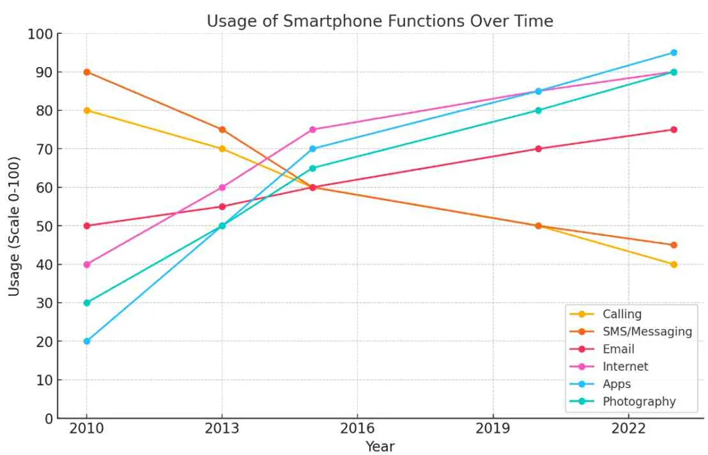 Hier is de grafiek die de trends van het gebruik van verschillende smartphonefuncties over de jaren heen laat zien. De lijnen vertegenwoordigen de schattingen van het gebruik van bellen, sms/berichten, e-mail, internet, apps, en fotografie van 2010 tot 2023. We zien duidelijk hoe het gebruik van apps en internet sterk is gestegen, terwijl bellen en sms’en afnemen. Fotografie neemt ook aanzienlijk toe dankzij verbeterde smartphonecamera’s.